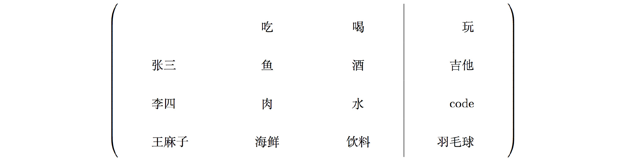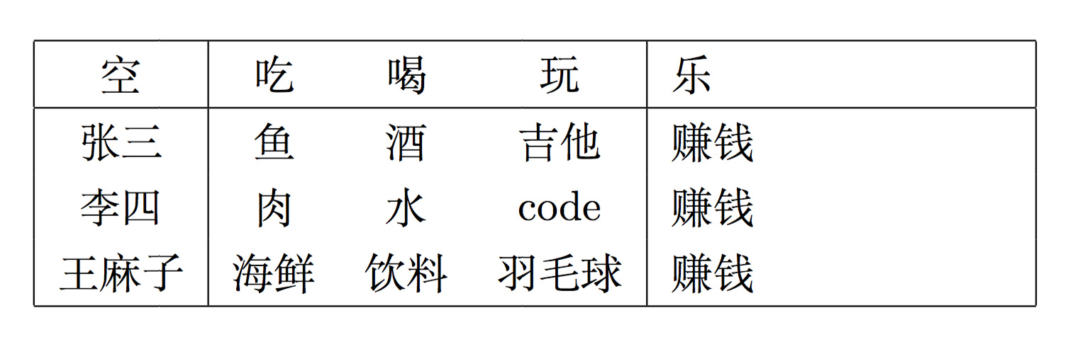 李四&肉&水&code\\